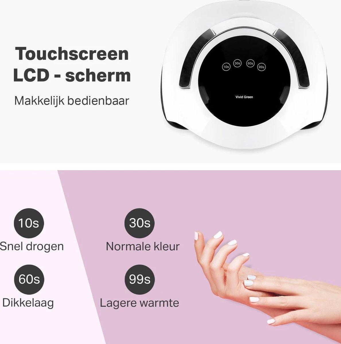 Onze nageldroger bevat vier timer functies: snel drogen (10s), normale kleur (30s), donkere kleur/dikke laag (60s) en lagere warmte (99s). De timer is naar wens instelbaar op het touch screen LCD-scherm en de lampjes gaan aan zodra je je hand in de nagel droger houdt en uit wanneer je handen uit de droger gaan. Deze gellamp lamp op UV led lamp is geschikt voor zowel handen als voeten.
